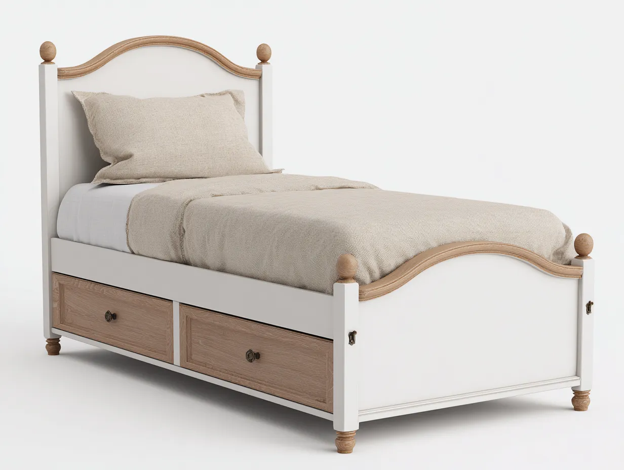 Das Einzelbett bietet eine komfortable Schlaflösung für kompakte Räume und verbindet klassisches Design mit zusätzlichem Stauraum. Die integrierten Schubladen im Bettgestell schaffen Platz für Textilien oder andere Wohnaccessoires und tragen zu einer ordentlichen Raumgestaltung bei.