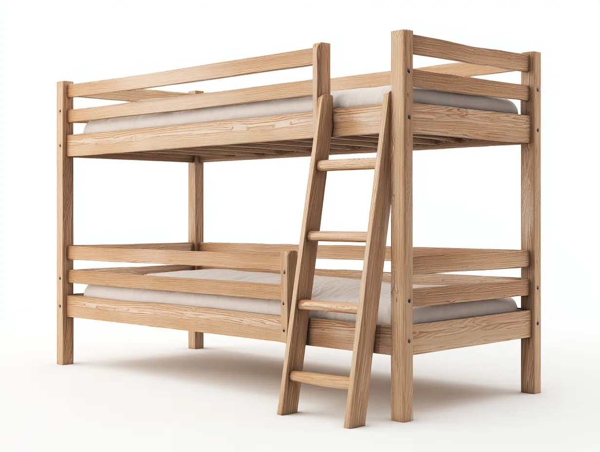 Das Bett verfügt über einen integrierten Aufstieg, der einen komfortablen Zugang zum oberen Schlafbereich ermöglicht. Umlaufende Seitenelemente erhöhen die Stabilität und unterstützen eine sichere Nutzung im Alltag. Die offene Konstruktion sorgt für eine leichte Raumwirkung und lässt sich gut mit verschiedenen Einrichtungsstilen kombinieren.