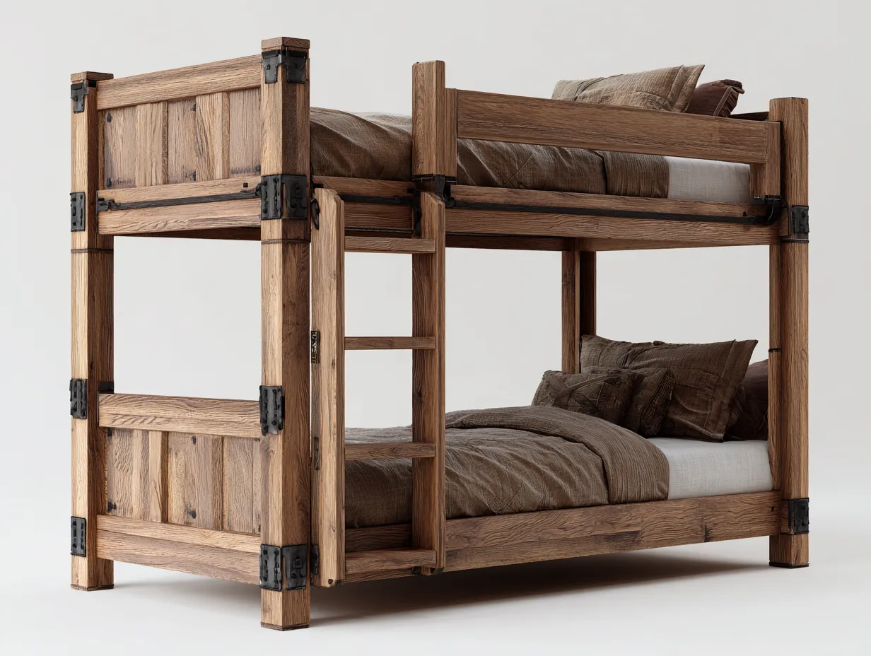 Die Konstruktion ermöglicht eine effiziente Nutzung der Raumfläche und bietet komfortable Schlafbereiche in einem kompakten Möbelstück. Der integrierte Aufstieg erleichtert den Zugang zum oberen Schlafbereich, während umlaufende Seitenelemente zusätzlichen Schutz bieten. Das stabile Gestell sorgt für sicheren Stand und passt gut zu rustikalen oder natürlichen Einrichtungskonzepten.