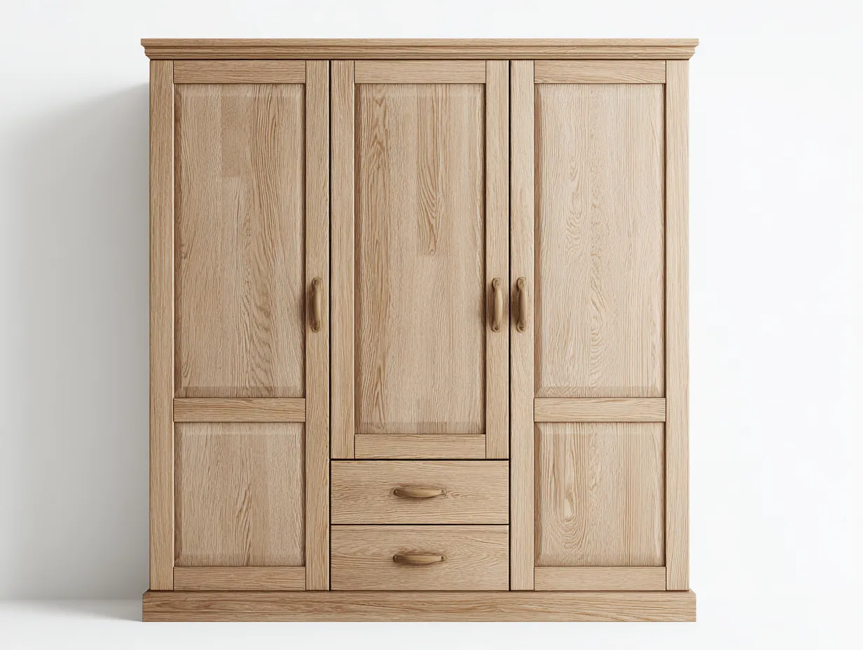 Die großzügige Breite sorgt für eine komfortable Nutzung im Alltag. Hinter den Türen befindet sich ein geräumiger Bereich für Kleidung und Heimtextilien. Der zusätzliche Stauraum im unteren Bereich erleichtert das Verstauen weiterer Gegenstände und unterstützt eine strukturierte Organisation im Schlafzimmer.
