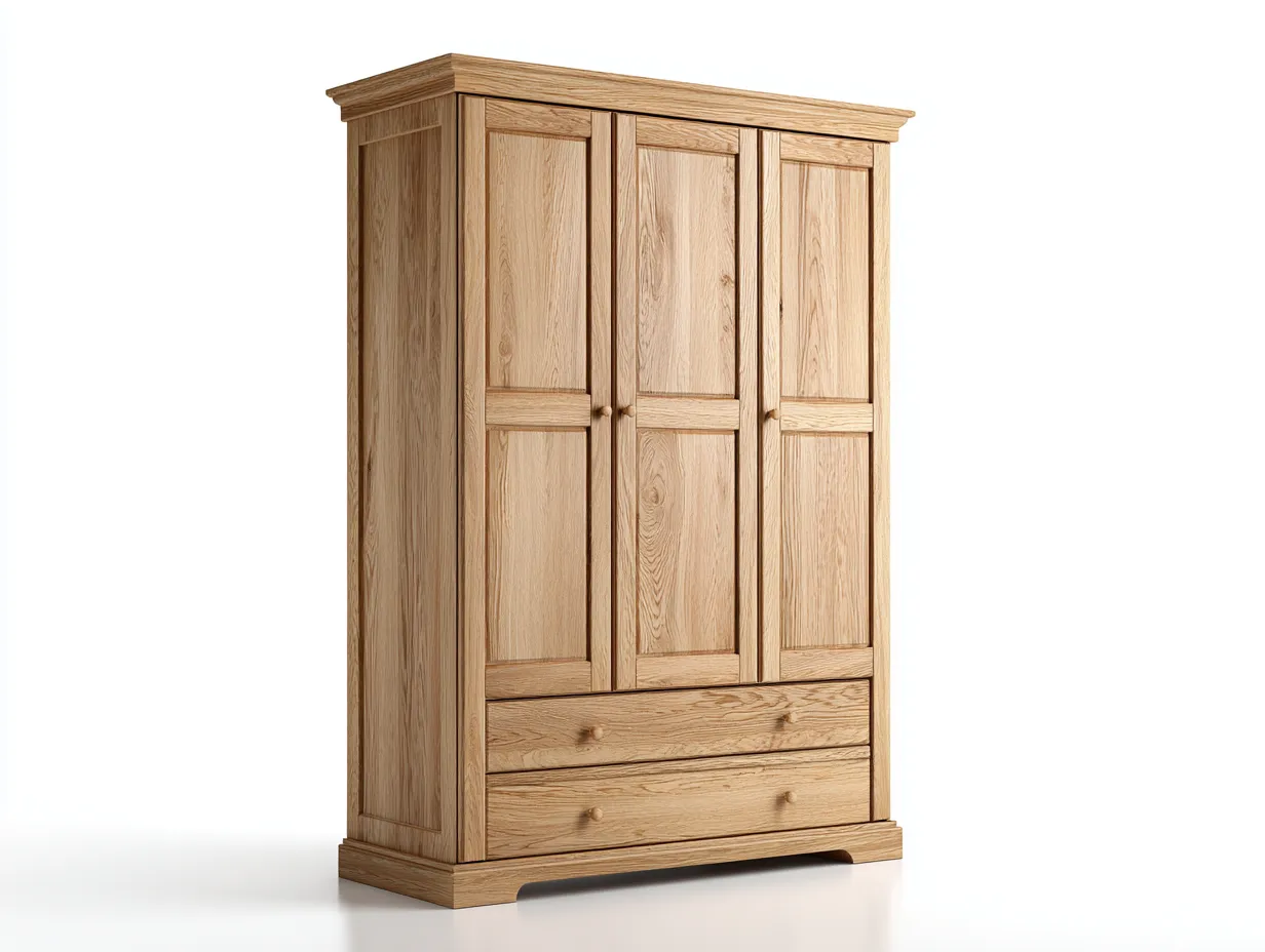Dieser Kleiderschrank mit drei Türen bietet eine praktische Aufbewahrungslösung für Kleidung und Heimtextilien im Schlafzimmer. Die klassische Gestaltung mit natürlicher Holzoptik sorgt für eine warme Atmosphäre im Raum und lässt sich mit verschiedenen Einrichtungsstilen kombinieren. Durch die klare Form und die großzügige Front entsteht ein harmonisches Gesamtbild, das sowohl funktional als auch dekorativ wirkt.