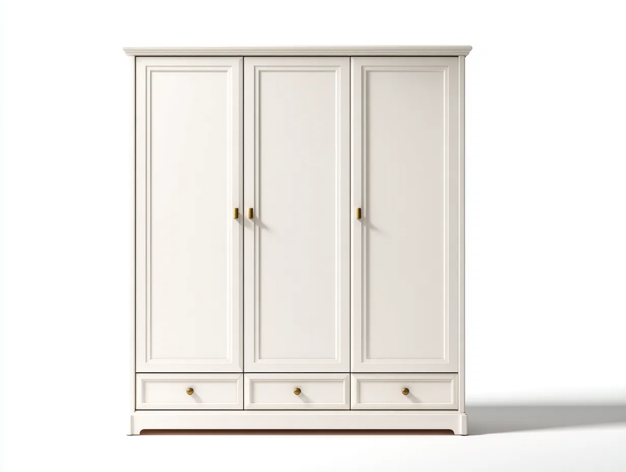 Die drei Türen ermöglichen einen komfortablen Zugang zum Innenraum und erleichtern das Verstauen von Kleidung. Der zusätzliche Stauraumbereich im unteren Teil unterstützt eine übersichtliche Organisation von Textilien und weiteren Gegenständen. Das klassische Erscheinungsbild passt besonders gut zu traditionell eingerichteten Schlafzimmern.
